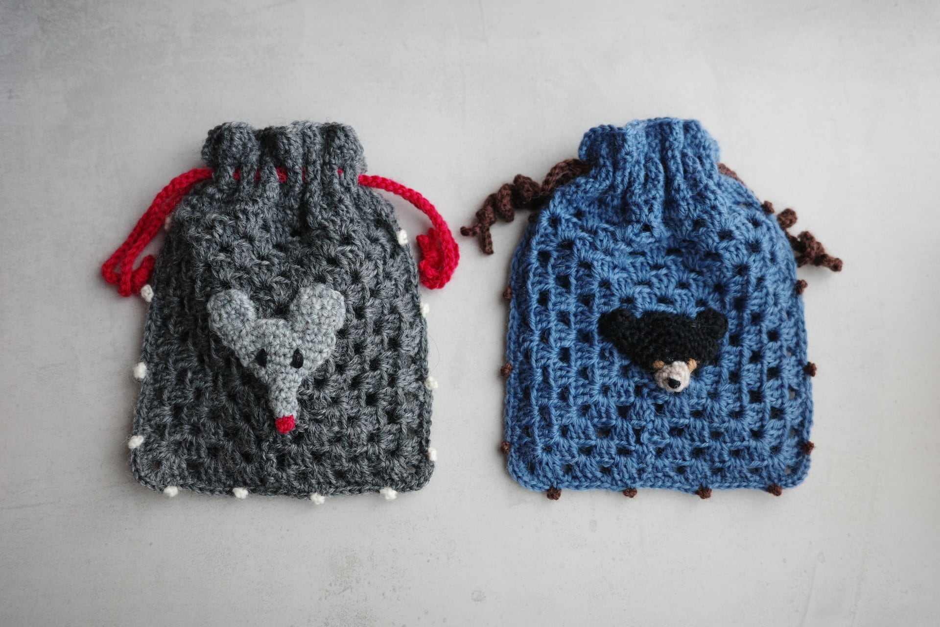 ・ねずみの大きめ巾着/ダークグレー×濃いピンク・ホワイト 2700円
