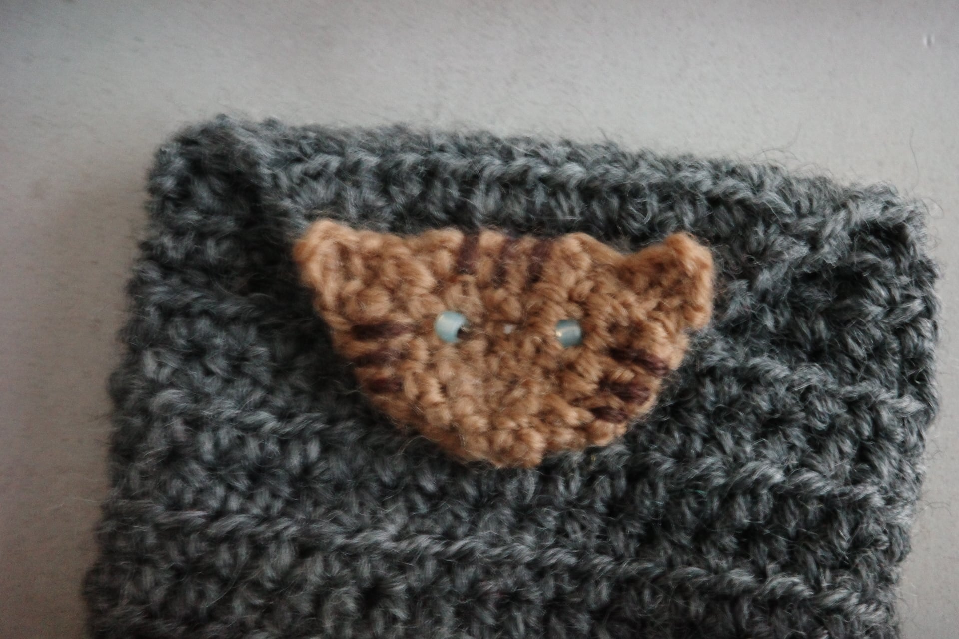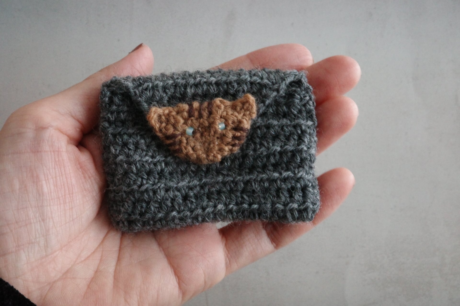 ビーズおめめの茶トラ猫のミニミニポーチ・ダークグレー(7×5cm)