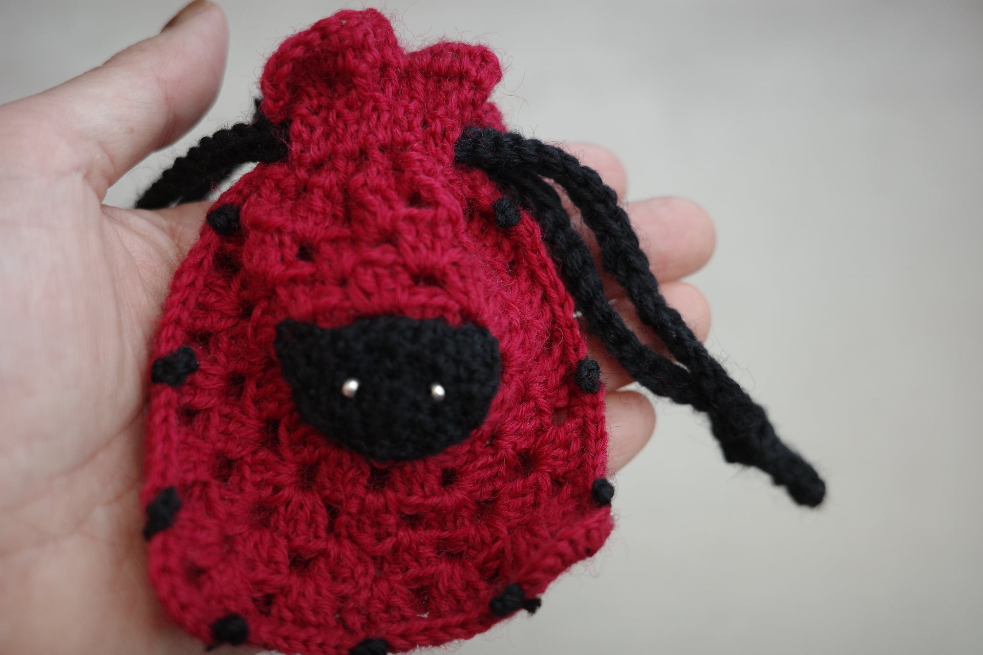 黒猫が縫い留めてあるかぎ針編みの巾着です。