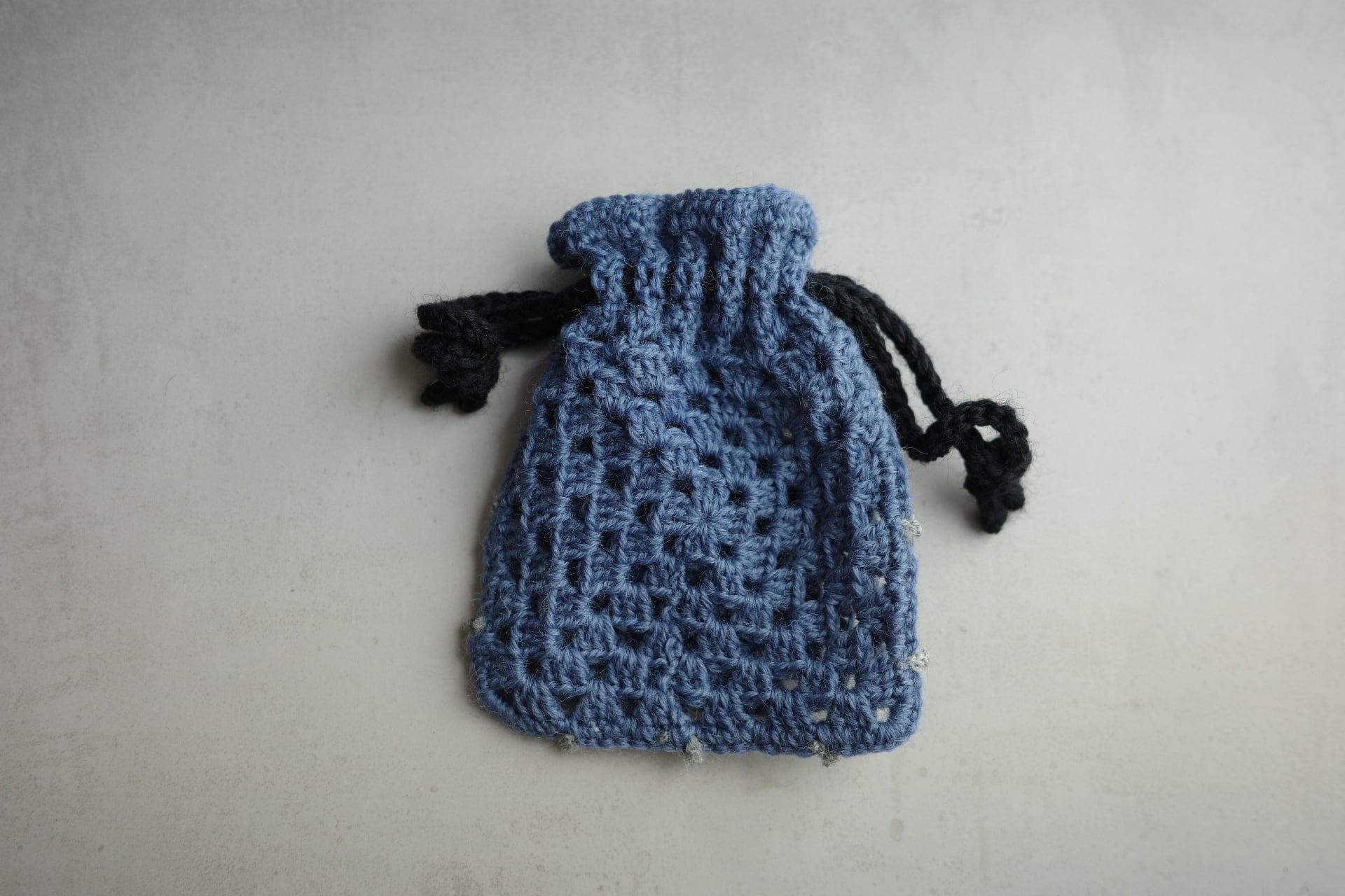 ぞうが縫い留めてあるかぎ針編みの巾着です。