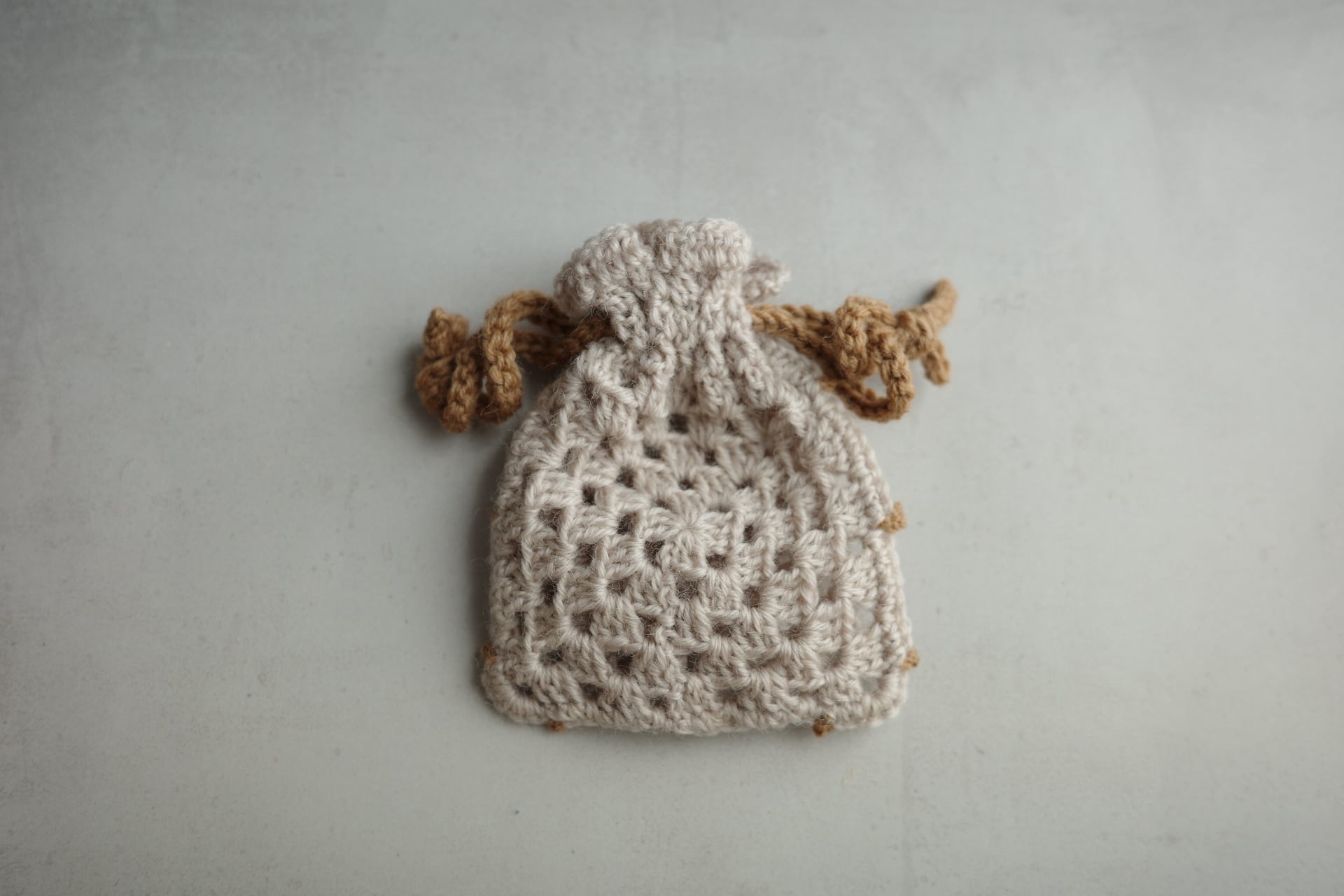 くまが縫い留めてあるかぎ針編みの巾着です。